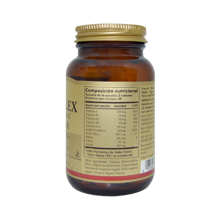 Categoría: Vitaminas y Suplementos Dietarios Laboratorio: SOLGAR Registro Sanitario: SD2017-0004029 Precio: $110.000 Valor por Unidad: 1.100 $ / Tableta Presentación: Tableta Volumen: 100 tabletas Observaciones: Este producto es un suplemento dietario, no es un medicamento y no suple una alimentación equilibrada Complejo de alta potencia que aporta las principales vitaminas del grupo B, y vitamina C añadida. Las vitaminas del grupo B ayudan a la producción de energía y a reducir el cansancio y la fatiga, apoyan el funcionamiento del sistema nervioso y, junto a la vitamina C, contribuyen al funcionamiento del sistema inmunitario.Combinación sinérgica de vitaminas B y C que apoyan la producción de energía - las vitaminas B6, B12 y C, el ácido pantoténico, biotina, niacina, riboflavina, tiamina contribuyen al metabolismo energético normal.Las vitaminas B6 y B12, niacina, riboflavina y el ácido pantoténico ayudan a disminuir el cansancio y la fatiga.Las vitaminas B6, B12 y C, la biotina, niacina, riboflavina y tiamina contribuyen al funcionamiento normal del sistema nervioso.Un refuerzo para el normal funcionamiento del sistema inmunitario - Las vitaminas B6, B12 y C y el ácido fólico contribuyen al funcionamiento normal del sistema inmunitario.Sin gluten.No contiene almidón, levadura, trigo, soja ni derivados lácteos y está formulado sin conservantes ni aromas.Apto para veganos Indicaciones: Para adultos, tomar una (1) cápsula al día preferentemente con las comidas. Tragar las cápsulas con ayuda de agua u otra bebida.No debe superarse la dosis diaria expresamente recomendada para este producto. ** Publicado utilizando Astroselling **