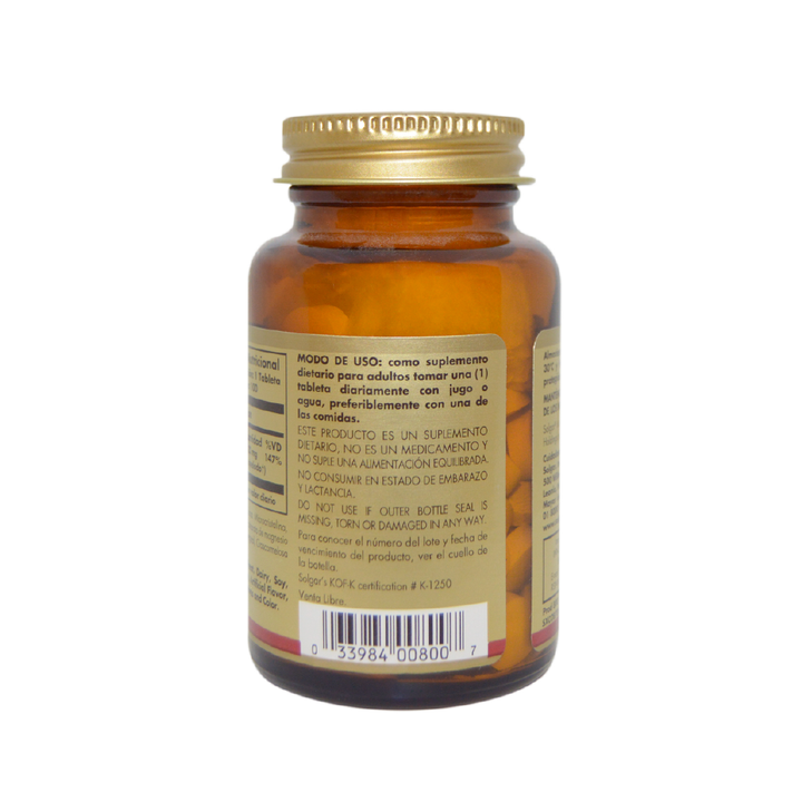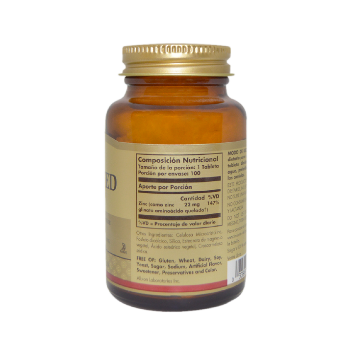 Categoría: Vitaminas y Suplementos Dietarios Laboratorio: SOLGAR Registro Sanitario: SD2017-0000275-R1 Precio: $87.000 Valor por Unidad: 870 $ / Tableta Presentación: Tableta Volumen: 100 tabletas Observaciones: Este producto es un suplemento dietario, no es un medicamento y no suple una alimentación equilibrada.Zinc Quelado de Solgar® aporta zinc de alta calidad en una forma de fácil absorción y alta biodisponibilidad con 22 mg de zinc elemental por comprimido. Mediante un proceso de quelación el mineral queda “envuelto” con dos moléculas del aminoácido glicina, lo que permite una absorción mejorada a través de la vía de absorción de aminoácidos.El zinc es un nutriente necesario para muchas funciones del organismo. Contribuye al funcionamiento del sistema inmunitario, al mantenimiento de la piel, cabello y uñas, a la protección de las células del daño oxidativo, y contribuye a la fertilidad masculina y femenina.Sin azúcares. Sin gluten.No contiene trigo, almidón, lácteos, soja, levadura, conservantes, edulcorantes, aromas o colorantes.Apto para veganos Indicaciones: Para adultos, tomar una (1) cápsula al día preferentemente con las comidas. Tragar las cápsulas con ayuda de agua u otra bebida.No debe superarse la dosis diaria expresamente recomendada para este producto ** Publicado utilizando Astroselling **