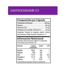 GASTROESSENS® es una fórmula a base de clorhidrato de betaína, pepsina y zinc, que tienen un rol clave en la funcionalidad del producto. Su propósito es adicionarse a la dieta normal generando efectos fisiológicos y nutricionales.
