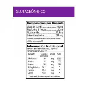 GLUTACEON contiene S-Acetil-Glutatión reducido, Riboavina–5-fosfato, Nicotinamida y Selenio. Es adicionada de la forma activa de la Vitamina B2, Riboavina–5-fosfato, Nicotinamida y Selenio. Todos los compuestos se encuentran en formas altamente biodisponibles, lo que juega un rol clave en la funcionalidad del producto. Su propósito es adicionarse a la dieta normal con el de generar efectos fisiológicos y nutricionales.