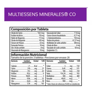 MULTIESSENS MINERALES® es una fórmula desarrollada para proveer todos los minerales esenciales en compuestos que aseguran una excelente biodisponibilidad, los cuales brindan una mejor nutrición celular y generan efectos siológicos y nutricionales. Contiene nutrientes esenciales como el Calcio, Magnesio, Fósforo, Potasio, Hierro, Zinc, Manganeso, Cobre, Cromo, Selenio, Yodo, Molibdato, Vanadio y Boro que tienen un rol clave en la funcionalidad del producto.