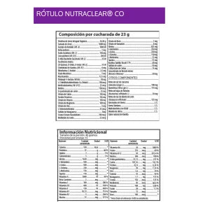 NUTRACLEAR®Fórmula a base de proteína de Arroz Integral Orgánico con Aminoácidos, Vitaminas y Oligoelementos Esenciales en sus formas activas y biodisponibles, Probióticos y Extractos de Plantas. NutraCLEAR® es un alimento funcional que genera efectos fisiológicos y nutricionales a base de proteína de arroz integral orgánico con los aminoácidos Glicina, L-Glutamina, L-Lisina, L-Cisteína, L-Metionina y Taurina, con las vitaminas A, B1, B2, B3, C, D3, Betacaroteno, Tocoferoles mixtos (Vit. E), Piridoxal-5-fosfato, Metiltetrahidrofolato, Metilcobalamina, Ácido pantoténico y Biotina, Oligoelementos esenciales como el Calcio, Magnesio, Fósforo, Potasio, Zinc, Manganeso, Cromo, Selenio, Molibdato, Vanadio y Boro. Además, NutraCLEAR® frutos rojos contiene otros ingredientes para potencializar sus efectos fisiológicos como la cepa probiótica Bacillus Subtilis, fuentes de Sulfatos, Colina, Concentrado de Brócoli entero (Brassica Oleracea), Cúrcuma (Cúrcuma Longa L.), Quercitina (Citrus spp L.), Polvo de hojas de Romero (Rosmarinus ofcinalis L.) y Polvo de raíz de diente de León (Taraxacum ofcinale). Sin carga glicémica; endulzado con glucósidos de stevia. Libre de gluten y lácteos. Libre de colorantes y sabores artificiales.
